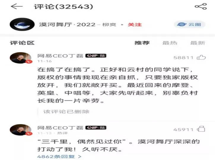 这让网易云音乐所面临的版权压力有所缓解,丁磊自己也出现在爆火歌曲《漠河舞厅》的评论区中,向用户表达自己对版权的重视,“在搞了在搞了,正好和云村的同学说下,版权的事情我现在亲自抓,我们就敞开买,最近回来的摩登、英皇、中唱等,大家先听起来,别辜负村长我的一片辛劳。”