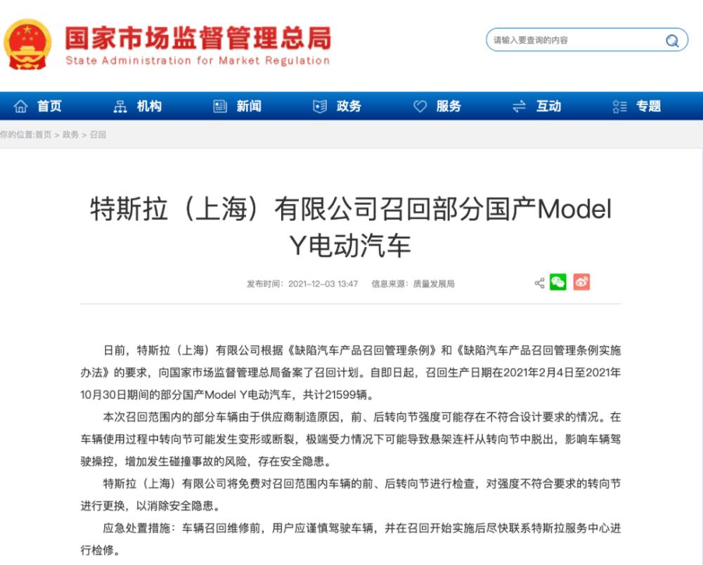 然而,当召回涉及到特斯拉时,消费者的态度、关注度却发生了明显的改变。日前,中国国家市场监督管理总局网站披露了上海特斯拉发起备案的召回计划。根据计划,特斯拉将召回生产日期在2021年2月4日至2021年10月30日期间的部分国产Model Y电动汽车,共计21599辆。