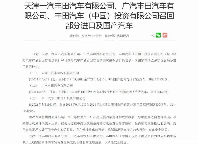 事实上,没有一家车企敢100%肯定自己生产的车完全不存在缺陷,就算是丰田也不行。这不,丰田又出问题了。12月10日,根据国家市场监督管理局消息,包括广汽丰田、天津一汽丰田、丰田汽车中国投资有限公司、四川一汽丰田有限公司以及长春丰越公司在内的五家企业,向国家市场监督管理总局备案了召回计划。