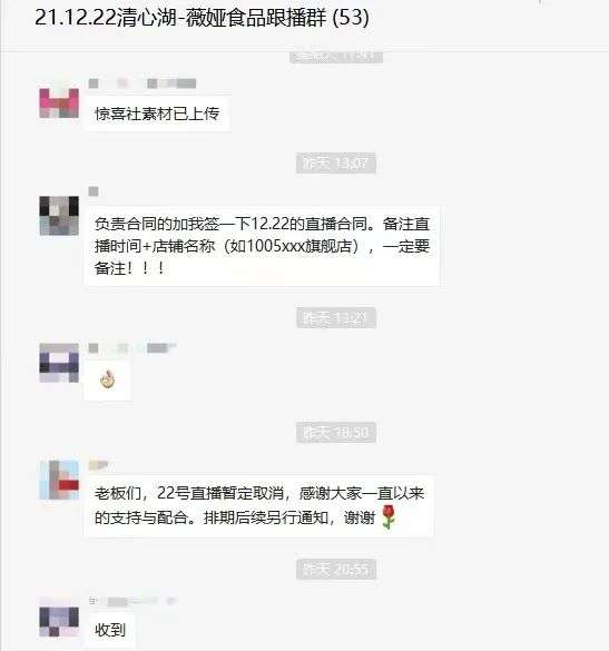 约定直播的几天前,团队上传好用于“薇娅惊喜社”直播预告的素材,一切准备就绪。12月20日下午1点,薇娅直播间的工作人员在跟播群里提醒“松鲜鲜”团队签一下12月22日的直播合同。正准备签合同,同时走打款流程,没想到在这时,就出了问题。