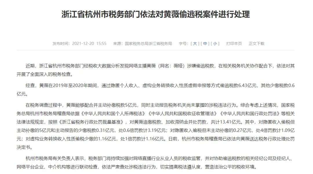 据杭州市税务局稽查局官方消息,薇娅在2019年至2020年期间,通过隐匿个人收入、虚构业务转换收入性质虚假申报等方式,偷逃税款6.43亿元,其他少缴税款0.6亿元。因此,依法对黄薇(薇娅真名)作出税务行政处理处罚决定,追缴税款、加收滞纳金并处罚款共计13.41亿元。