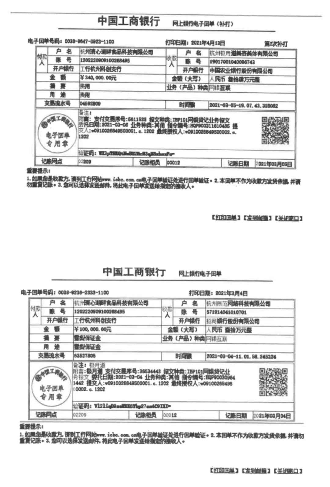 易子涵介绍,由于雪梨是头部主播,签合同时,品牌方对合同没有任何修改的权利,并且一概是先付款后执行。基于对雪梨和宸帆的信任,开播之前,品牌就把一半的定金分别打入了中介机构及宸帆的账户,合计44万元(包括10万元保证金)。