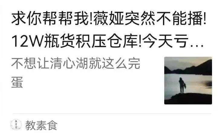 守着这么多库存,走投无路的易子涵只能求助朋友圈,21日下午,她在松鲜鲜微信公众号“教素食”上发布了一封题目为《求你帮帮我!薇娅突然不能播!12W瓶货积压仓库!今天亏本清仓!》的“求救信”。在信中,易子涵讲述了一年来自家品牌与各种主播合作的“血泪史”,提到了因为薇娅直播取消导致公司目前存在的库存积压问题。