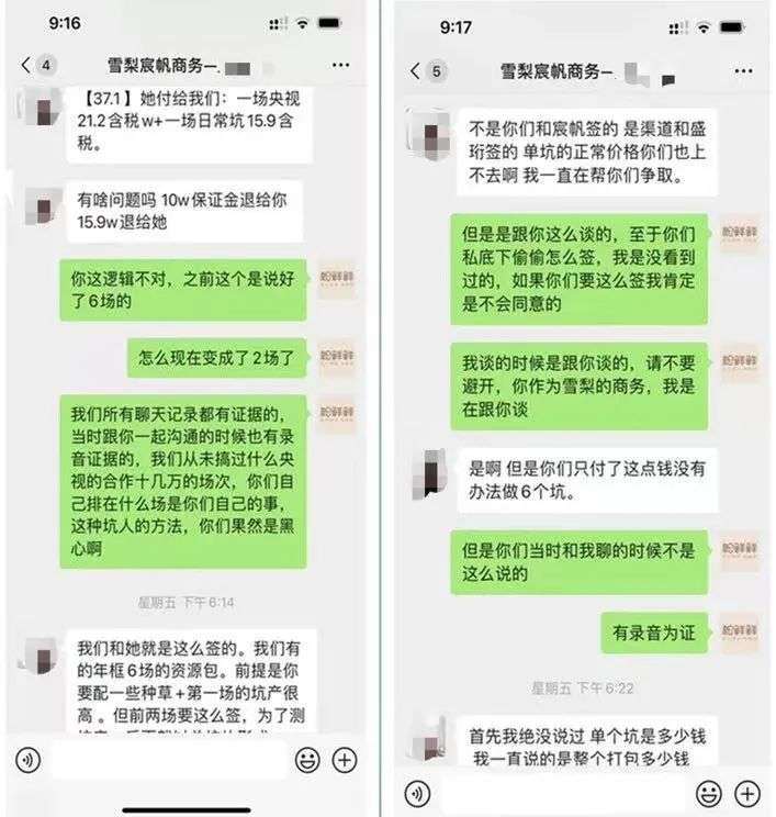 12月17日,在和中介多次沟通无果后,易子涵找到当时在雪梨公司接待易子涵的商务,该商务同意退费和解,但给出的解决方案里,6场直播的半年框坑位费,变成了2场的价格。