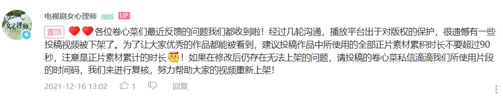 面对参与者的质疑,电视剧官方并没有给出明确的答案。只是在电视剧《女心理师》的官方剪辑活动里,置顶了一条评论,说明下架视频是“播放平台出于对版权的保护”,同时“建议投稿作品中所使用的全部正片素材累计时长不要超过90秒”。