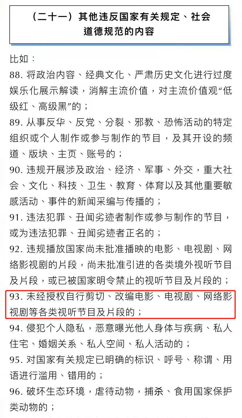 12月15日,中国网络视听节目服务协会发布《网络短视频内容审核标准细则》(2021)(下简称《细则》)。《细则》中明确禁止未经授权自行剪切、改编电影、电视剧、网络影视剧等各类视听节目及片段的行为,第一次以官方的姿态为短视频内容审核定下标准。