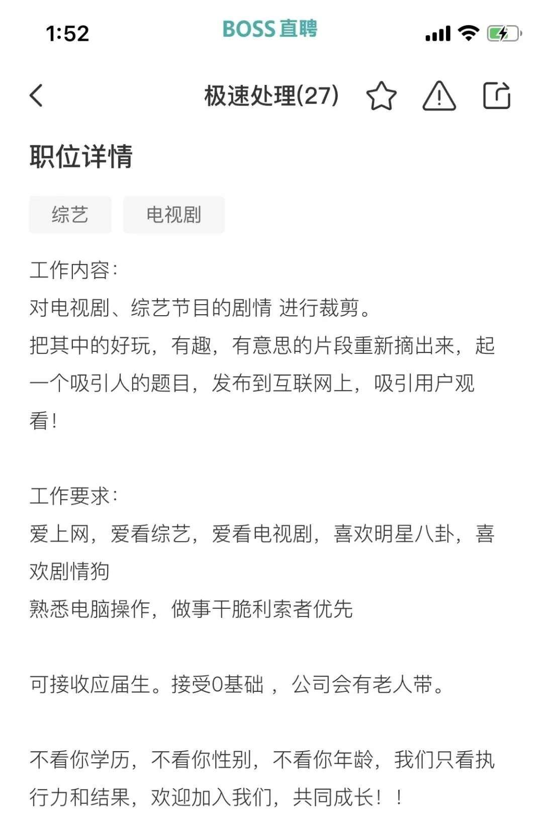 这类岗位的工作内容也相对简单,主要是对电视剧、综艺节目的剧情进行裁剪,将其中好玩、有趣、有意思的片段重新摘出来,起一个吸引人的题目,发布到互联网上,吸引用户观看。