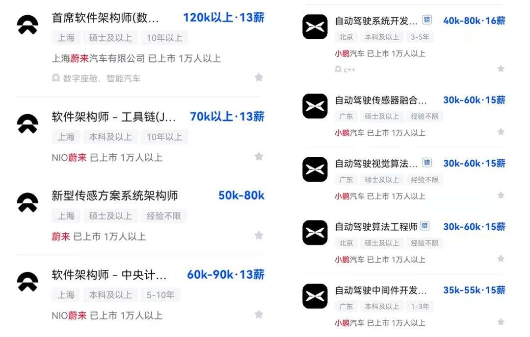 对于首席软件架构师(数字座舱操作系统)岗位,蔚来就开出了“月薪120k以上,13薪”,即年薪超过150万的丰厚报酬;小鹏对车载系统开发专家的酬薪也给到了“月薪80k,16薪”的水准,相当于130万年薪。但HR也直言,“拿着百万年薪也找不到人。”