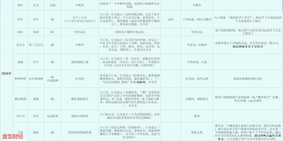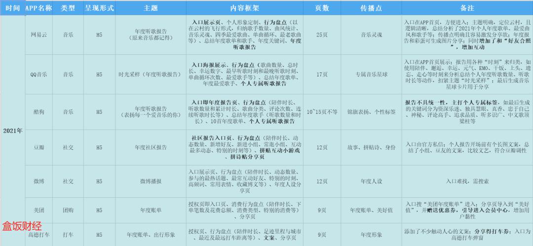 内容框架,盒饭财经分析后认为,至少要包含三个部分,即入口展示页、行为盘点和生成个人专属年度报告。当然根据平台属性不同,可以增加不同的内容,如音乐类一定会总结年度歌单、年度最爱歌手等。