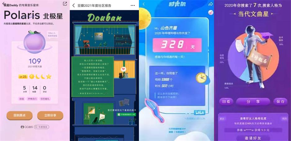 从呈现形式来看,互联网大厂几乎选择的都是H5,原因也是页面简洁、用户操作难度不高,同时方便分享。对平台而言,也容易和平台数据进行融合和提炼。当然也可辅助视频或者使用动态影集等新颖的形式,参见哔哩哔哩和小红书。