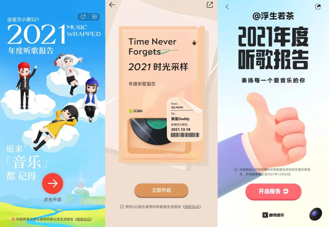 2021年度的听歌报告,比以往来得更早一些。12月27日,网易云、QQ音乐、酷狗同天发布了年度听歌报告。