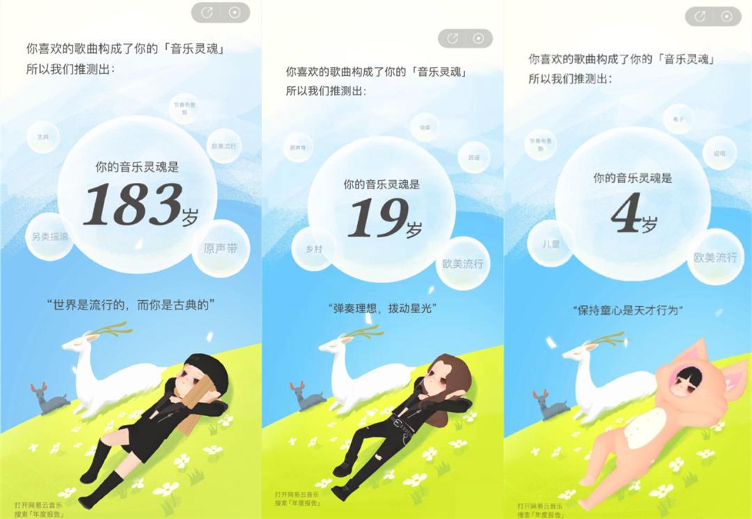 目前,在数据维度上,较为单一。以音乐类为例,一致指向注册时长、听歌数量、单曲循环最多次、曲风类型、最爱的歌手、特殊时刻(最早或最晚)等。社交类APP,分享页无论是微博、滴滴的年度人设,高德地图的年度形象,还是百度的搜索人格,都指向人物个性标签。