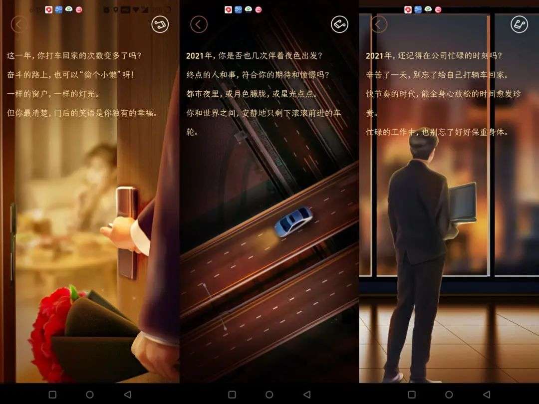 近几年,在文案风格上,都不约而同选择走起煽情路线,但有些并不打动人。比如,2021年高德地图的年度报告中,加上入口页、输出页总共9页的H5中,引用了3张煽情文案,但文案内容却并没有那么戳人。