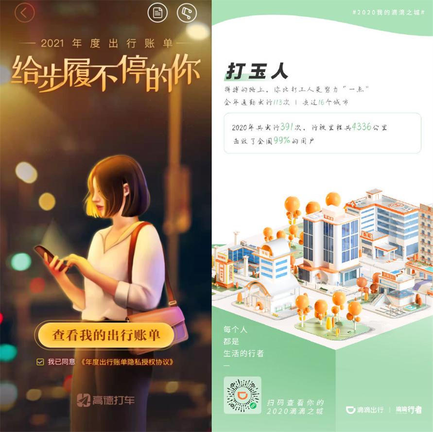 高德打车和滴滴,一个侧重年度账单和个人专属出行形象(城市穿梭人,你是奔走族也是生活派),一个侧重“我的滴滴之城”,在哪些城市留下了你的足迹。