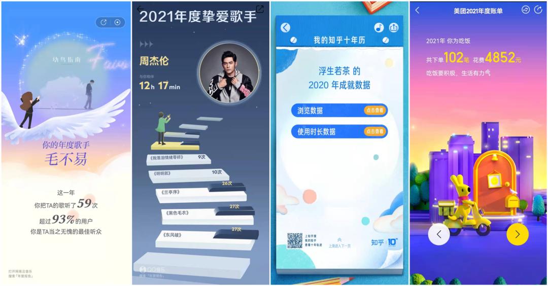 音乐年度报告会告诉你“哪一天熬了最长的夜”,微博年度报告会告诉你“你们一起陪伴了多少天”,美团外卖年度报告告诉你“你在凌晨点过几次外卖”,打车软件年度报告会安慰你“无论多晚,我都在”,淘宝年度趋势账单告诉你“你为什么会这么穷”,最后支付宝年度账单告诉你“自己竟然会这么有钱”......