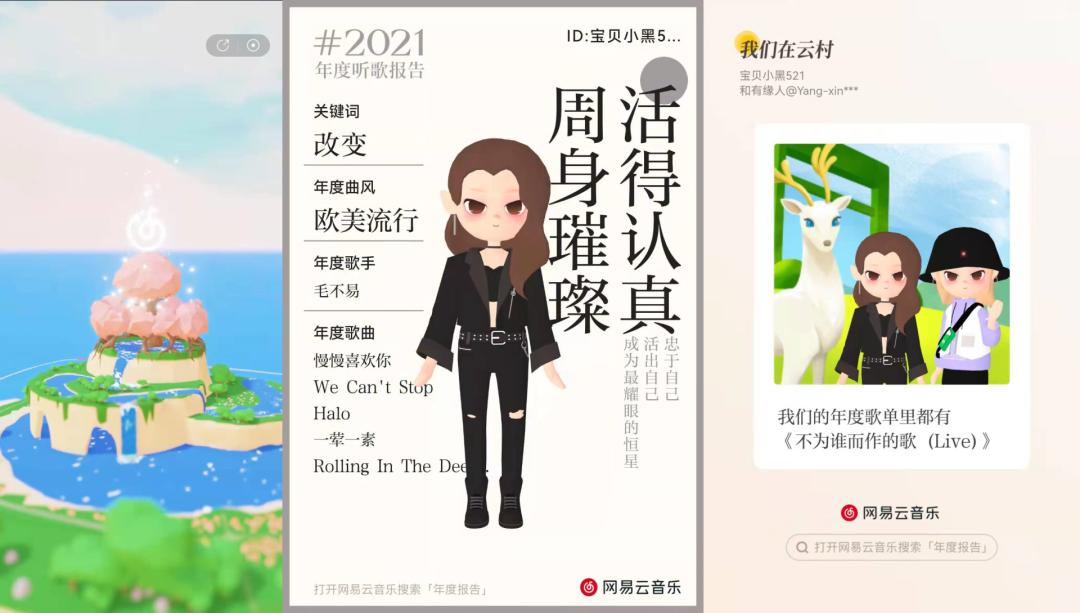 打开网易云音乐的听歌报告,映入眼帘的就是一个宁静温馨的“云村”场景,以及欢快的背景音乐。出发去往2021前,用户需要选择定制化的虚拟人物形象,架上“云”飞往村落,随即就展开了在网易云的故事。