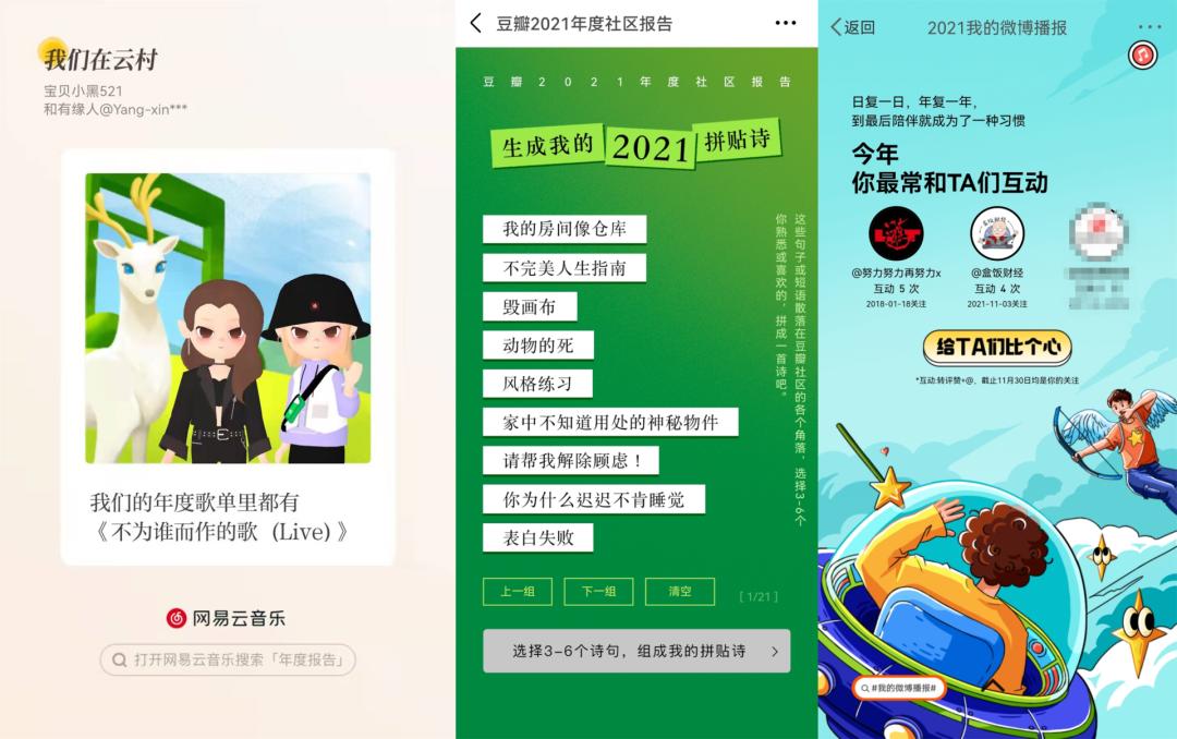 行为盘点涵盖的内容则较为复杂,根据平台类型划分,音乐类软件(网易云音乐、QQ音乐、酷狗)最常会统计的是听歌数量、累计时长、单曲循环次数、曲风类型、四季最爱歌曲、最早听歌时刻和最晚听歌时刻等;社交类平台,通常会统计到一年的动态数量、互动最多的动态、特殊时刻等,以豆瓣和微博为例,前者社交人群更加集中,所以更侧重新增好友、新进小组、常逛小组等动态,后者则关注更多的是参与的最热话题、最常互动好友、高频次的使用、常用表情和收藏博文等。