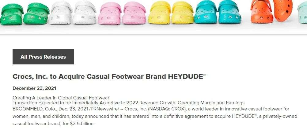 值得注意的是,在收购消息发布的当天Crocs股价应声下跌12%,创该公司2020年4月以来最低价。