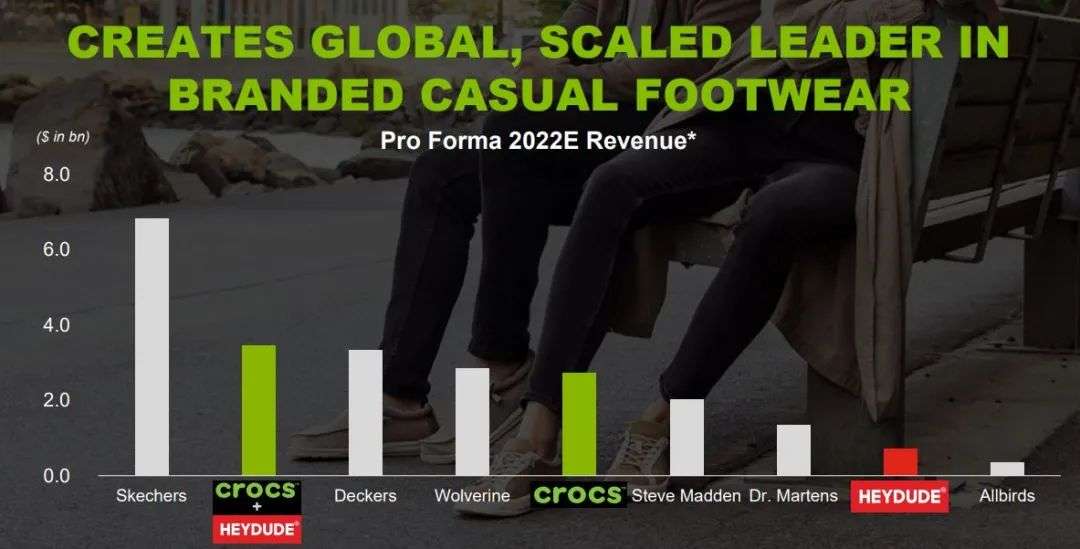预计今年Hey Dude将带来约5.7亿美元的收入,2022年Hey Dude的销售额将在7亿至7.5亿美元之间。Crocs+Hey Dude将使其在全球品牌休闲鞋领域排名从全球第5上升至全球第2,仅次于斯凯奇。