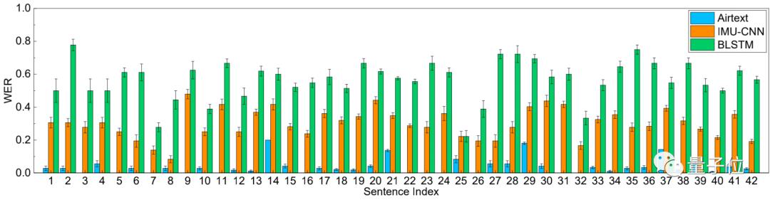 由于BLSTM基线的WER约为57%,错误率太高,研究人员只比较了AirText和IMU-CNN两者的速度。