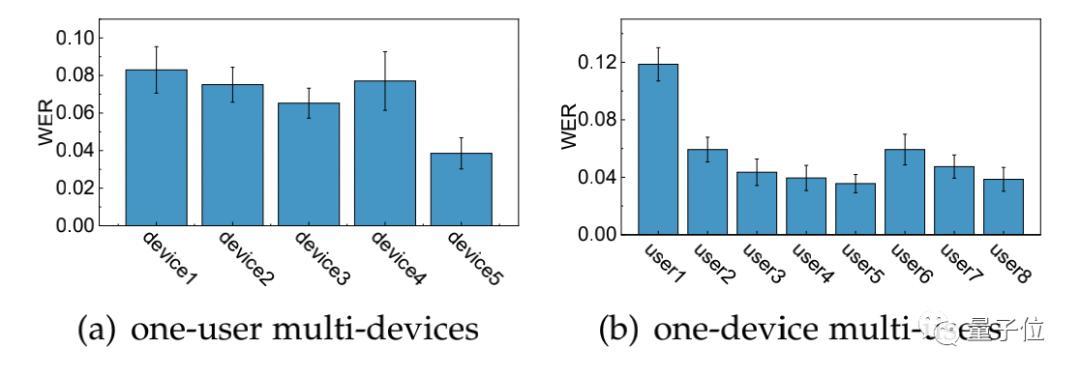 右图中,8位不同用户使用同一手表获得了11.2%、5.9%、4.3%、4.0%、3.6%、5.9%、4.7%和3.9%的WER。