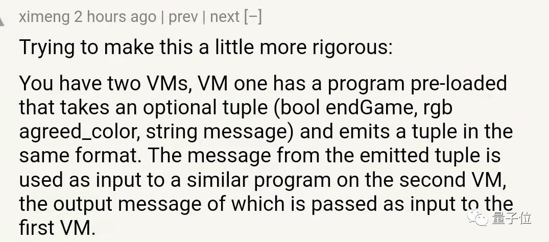 将参赛者转化为一个虚拟机(VM),拥有元组(bool endGame, rgb agreed_color, string message),VM1的这一消息组将作为输入发送给VM2。
