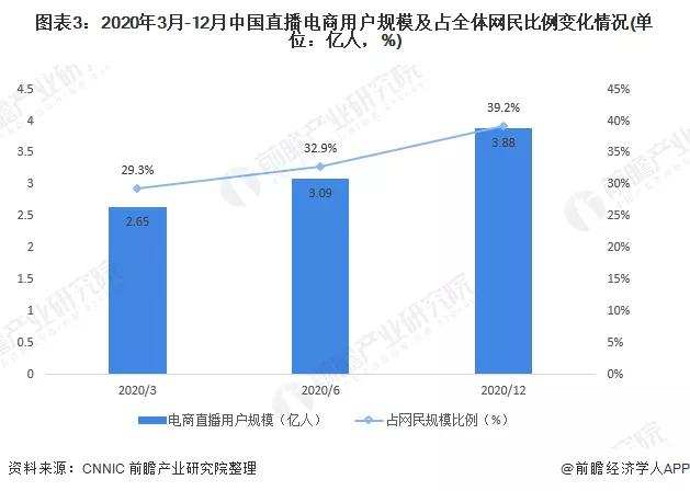 此外据《电商报》报道,今年双十一淘宝近8成的成交额是通过直播贡献。2021年2月,CNNIC发布《第45次中国互联网络发展状况统计报告》数据显示,截至2020年12月,我国直播电商用户规模达3.88亿人,占网民整体的39.2%。