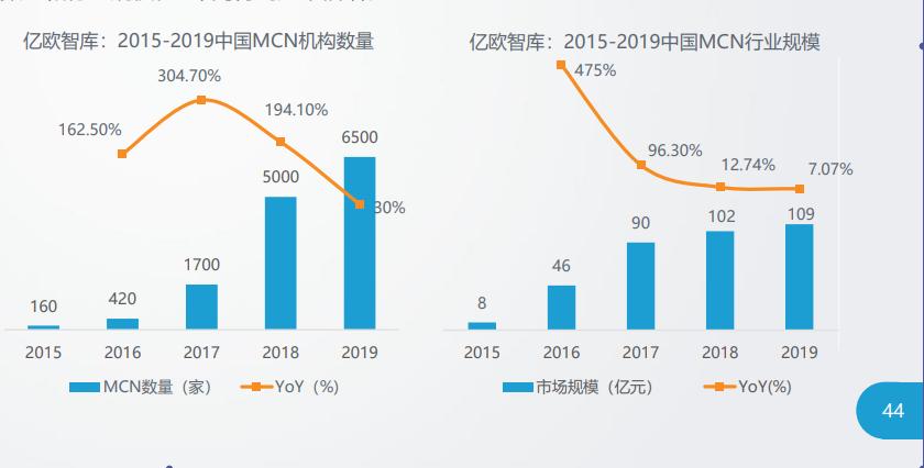 根据亿欧智库数据,国内MCN机构数量从2015年160家增长到2019年超6500家,这些MCN机构致力于培养主播成为平台流量生态的重要组成部分。