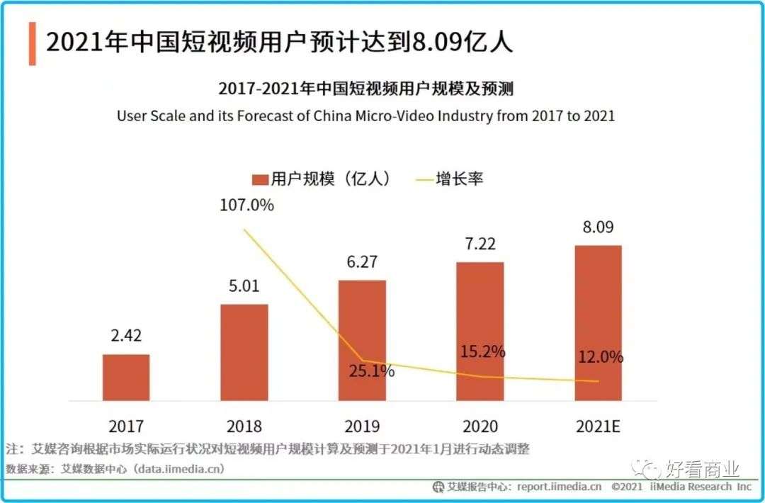 据iiMedia Research的数据,2020年,国内短视频用户7.22亿;2021年有望达到8.09亿。