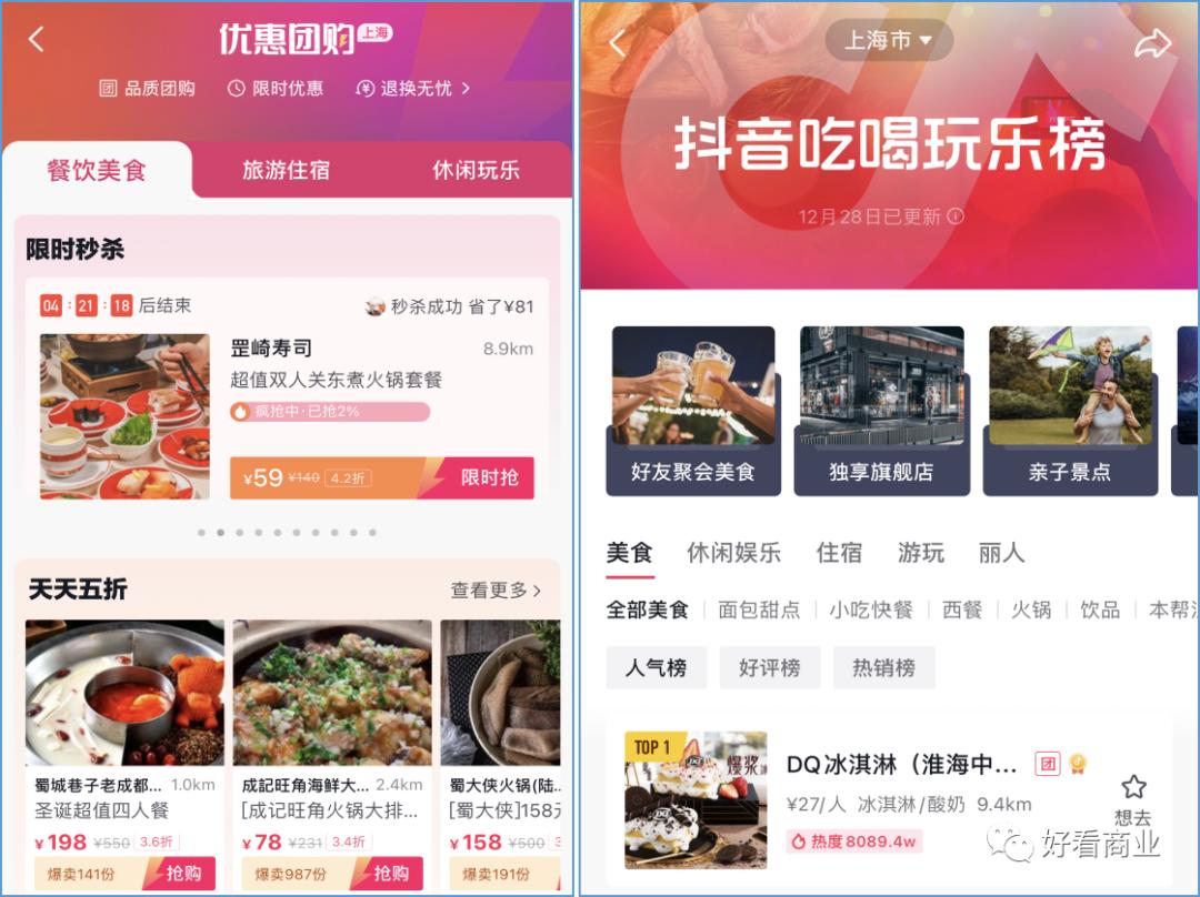目前,抖音APP“同城”界面已上线了“限时秒杀”和“热门榜单”,前者提供餐饮、酒旅、休闲娱乐的产品团购,用户可以直接下单;后者类似大众点评,按人气、好评、热销为用户提供提供吃喝玩乐相关的商家榜单。