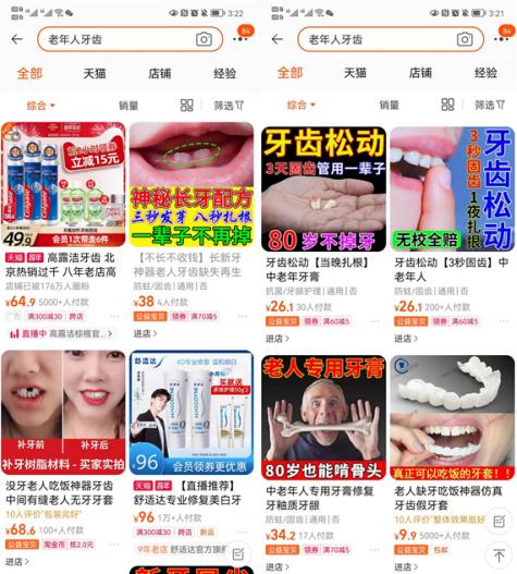 为了针对老年群体进行推广,部分牙膏还会打出夸张的广告语,如“当天固齿,永不掉牙”“新牙冒尖再付款”“神秘长牙配方”“告别种牙”“三秒发芽,八秒扎根”等等。打开产品的详情页,所售产品均为牙膏。