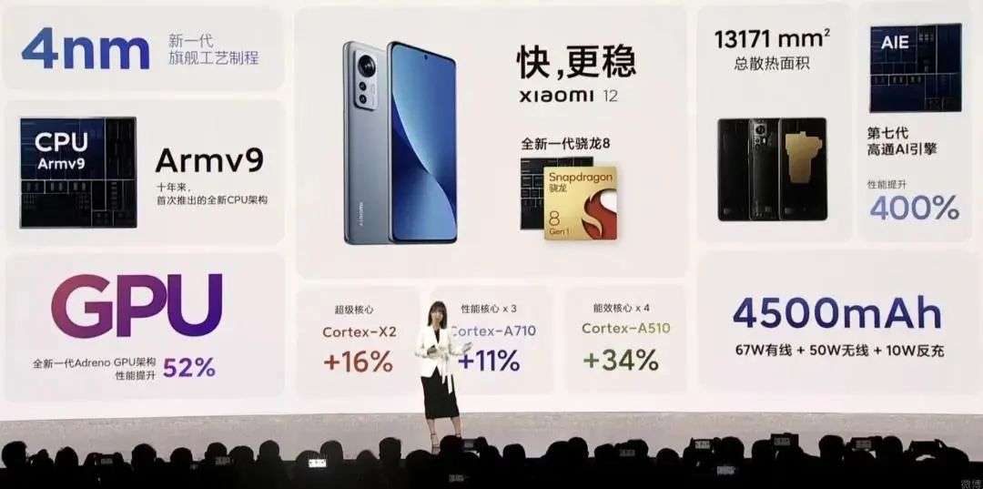 其他方面,小米12 Pro补上了小米12缺失的120W快充,同时内置了自研的澎湃P1电源管理芯片,主要用于控制启动和保护电路。但对于这款芯片,雷总并没有过多的介绍。另外,小米12 Pro内置四单元立体双扬,比小米12立体感更强。