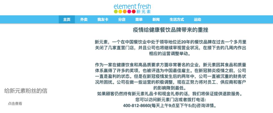 在新元素的官方网站上,有一封给新元素粉丝的信。信件内容显示:在过去一个月里,新元素关闭了几家直营门店,公司将继续审视营业状况,在接下来的几周内做出相应的运营调整举动。