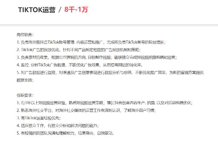 在智联招聘上,TikTok运营人员的月薪,也高达8000-10000元。