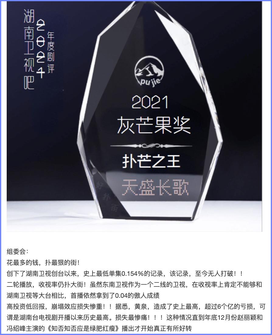 再往前的2018年,陈坤和倪妮主演的《天盛长歌》打破了湖南卫视黄金档最低收视的历史记录,被贴吧网友投票成为“扑芒之王”,来自护卫艇的评价是:“花最多的钱,扑最狠的街!”