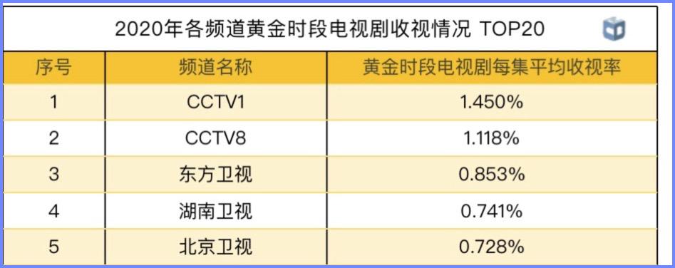 中国视听大数据显示,2020年各频道黄金时段电视剧收视情况,湖南卫视仅居第四,在地方卫视中落到了第二名。