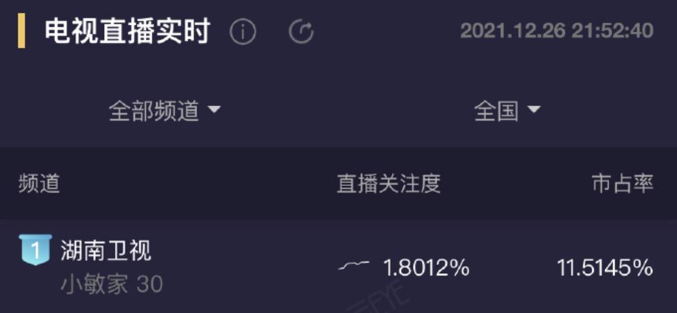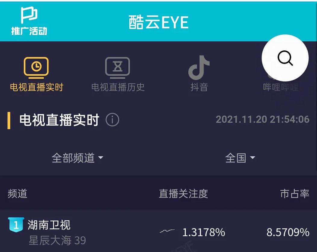 它的酷云实时直播关注度峰值一度高于1.8%,市场占有率超过11%,成为同时段全频道第一,单日直播关注度最高已有1.5801%。