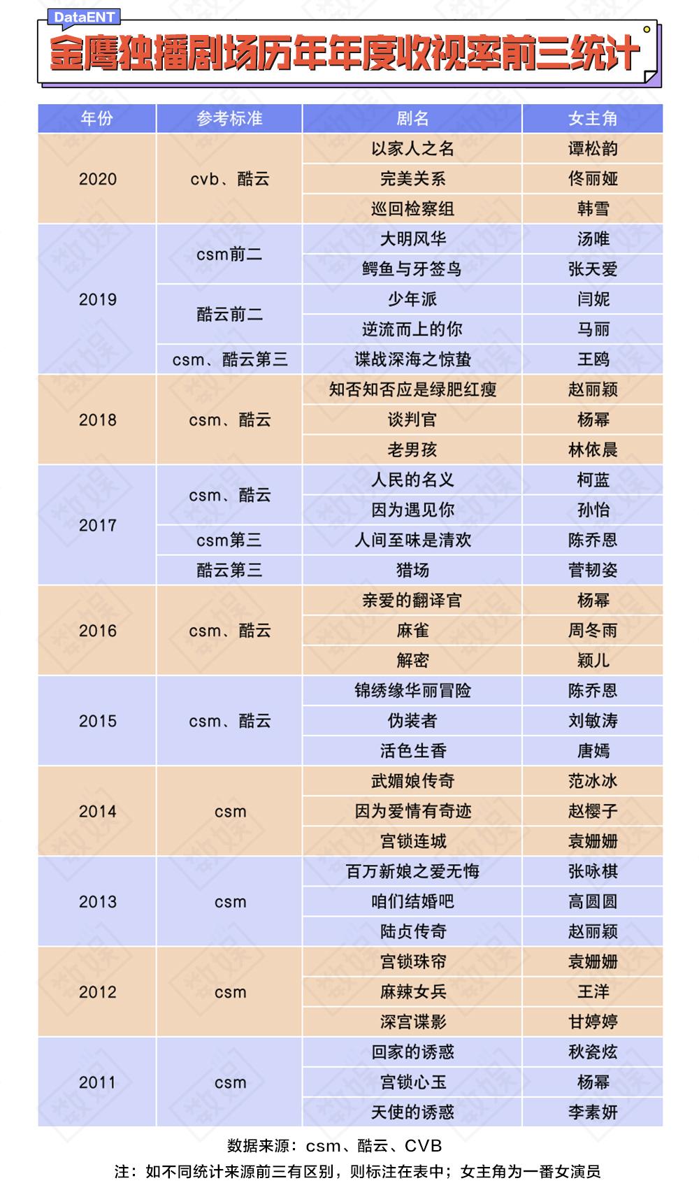 带着好奇,数娱君统计了自2011年来金鹰独播剧场的年度收视率排行前三。(此处需提前说明,在2012年以前,金鹰独播剧场曾被调至十点档,直到2012年6月才重回七点半到十年之间的黄金晚间档。)