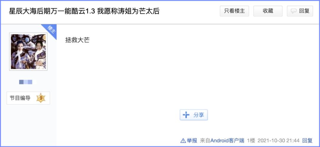 因此,有网友在湖南卫视贴吧留言,称“星辰大海万一能酷云1.3,我愿称涛姐为芒太后”。