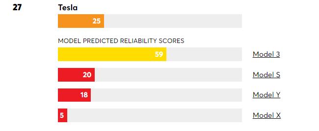 11月出炉的美国《消费者报告》的2021年汽车可靠性报告显示,特斯拉可靠性倒数第二,仅高于林肯汽车。其中Model X的可靠性得分最低,仅为5分。