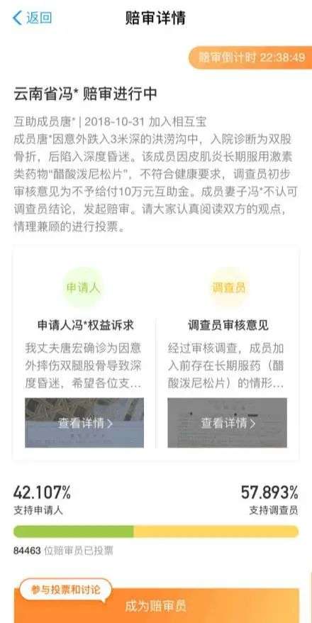 根据相互宝的数据,这起赔审上线不到 5 小时,超过25 万赔审员参与投票,其中 58% 的人投下了反对票,比票数更胶着的是正反两方的观点交锋,超过 80 万用户参与讨论,最终以申请人主动撤回赔审申请告终,相互宝也维持了原来的调查结果。