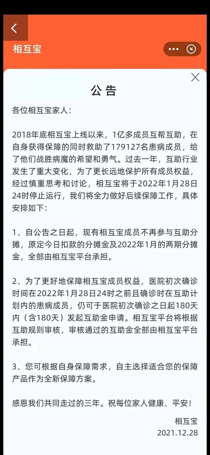 12 月 28 日,相互宝发布公告,表示将于 1 月 28 日停止运行。支付宝的这个「大病互助计划」在争议中拉开序幕,如今也在争议中落下了帷幕,从 2018 年至今,有 1 亿多人参与其中,救助了 179127 名患病成员。