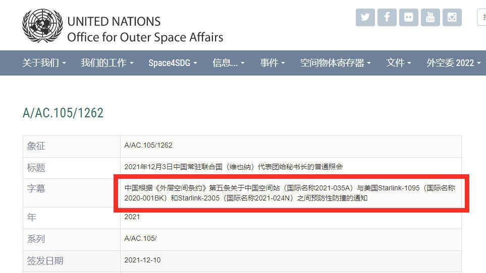 10月21日,星链-2305卫星与中国空间站发生近距离接近事件。