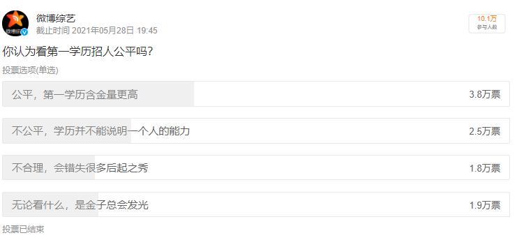 在《非正式会谈》热播时,“招聘是否应该看重第一学历”这一问题引发热议。微博综艺发起的投票中,有38%的人都认为第一学历含金量更高。