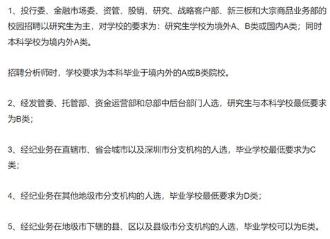 譬如:投行委要以A类学校研究生为主(基本只要A类);资金运营部最低要求是B类学校等。