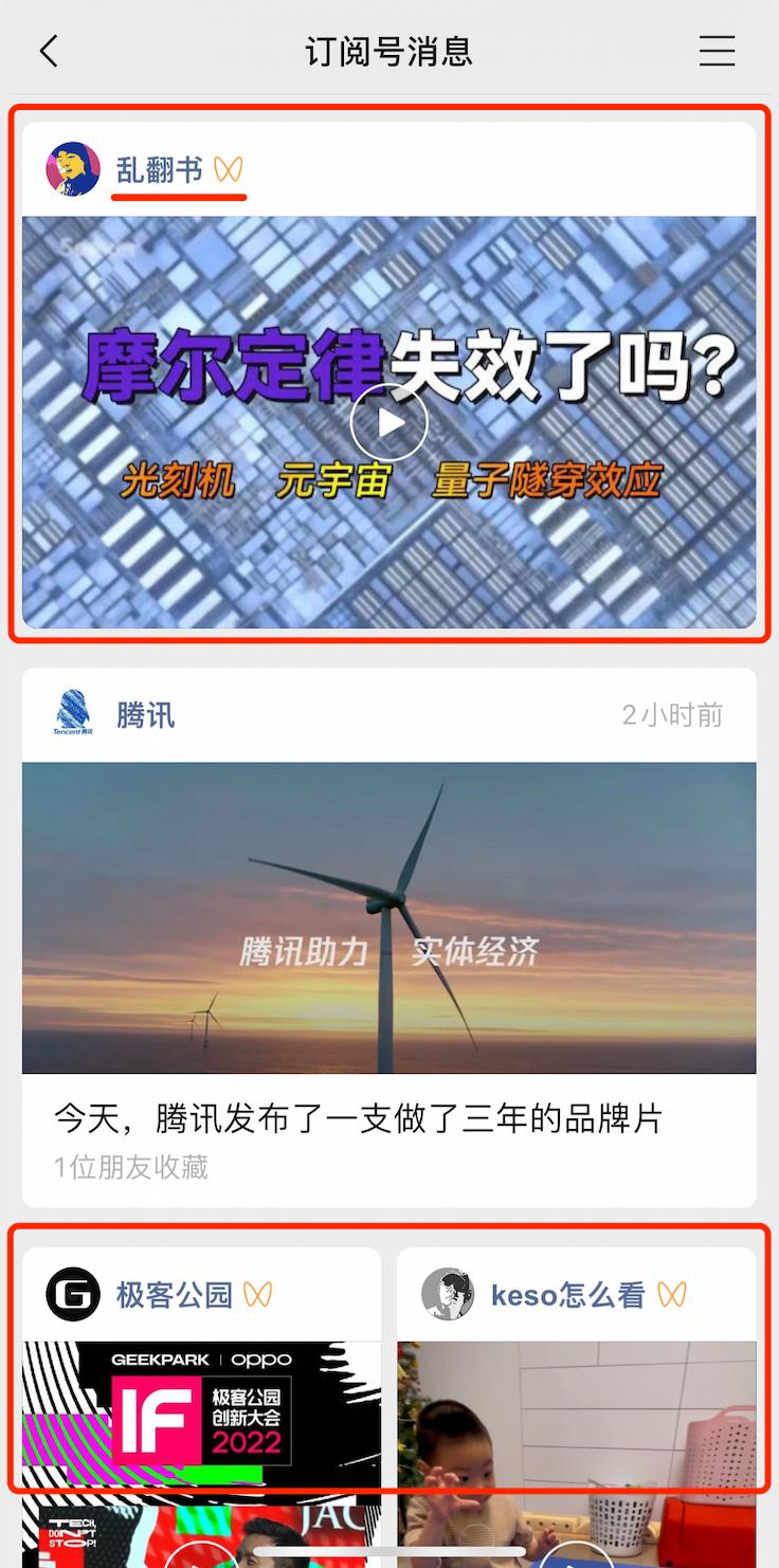 第一个红框内的信息虽然看起来像视频内容,但实际上推送的是来自视频号的内容。