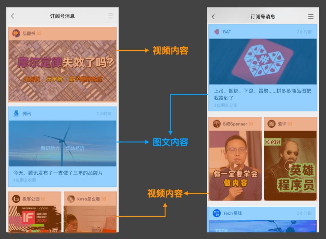 在图文中间穿插视频内容其实在某种程度上是打破了这种范式的,尤其是那种并排摆放两个视频号内容的设计,有点别扭。