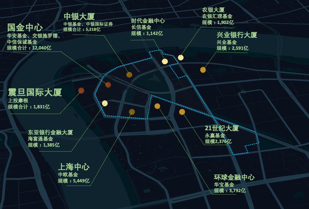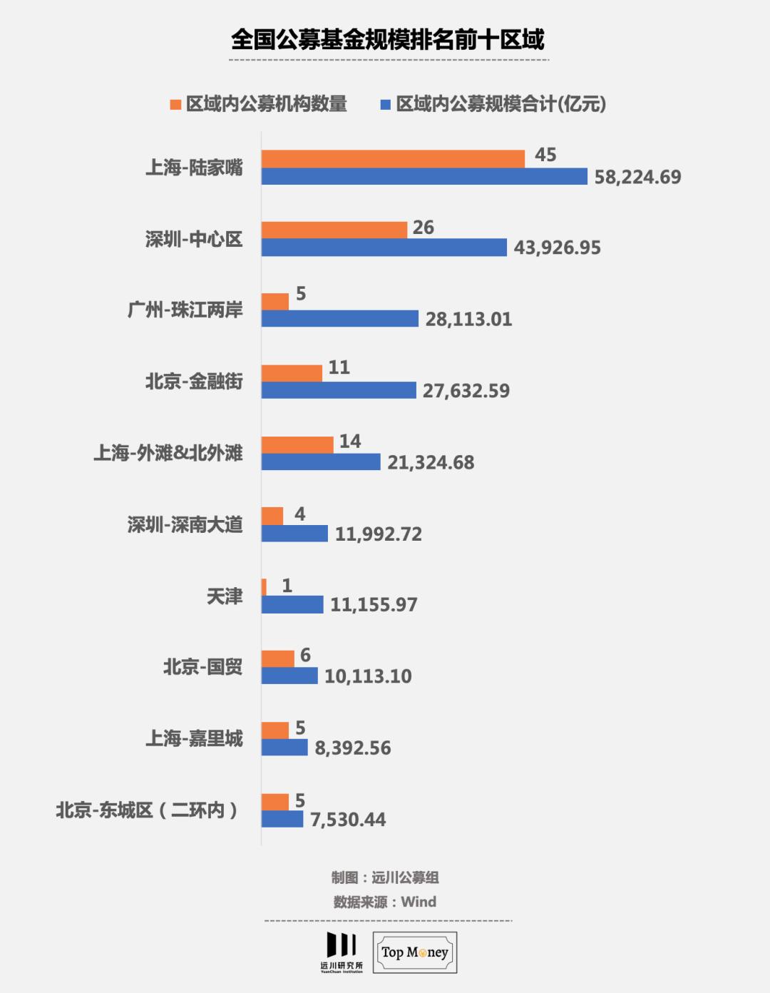 如果以各城市标志性的金融密集区域、著名建筑为锚点,统计区域内的公募基金公司,全国公募基金合计规模排名前四的区域分别为:上海陆家嘴、深圳中心区、广州珠江两岸和北京金融街,其中尤以陆家嘴最为密集。