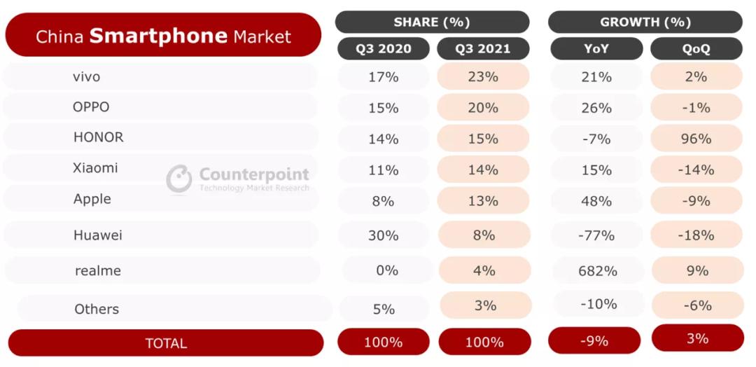 同时在国内智能手机市场,小米又被荣耀以15%市场份额超越,以13.6%的占比排名第四,排名前二的分别是vivo(23%)和OPPO(20%)。