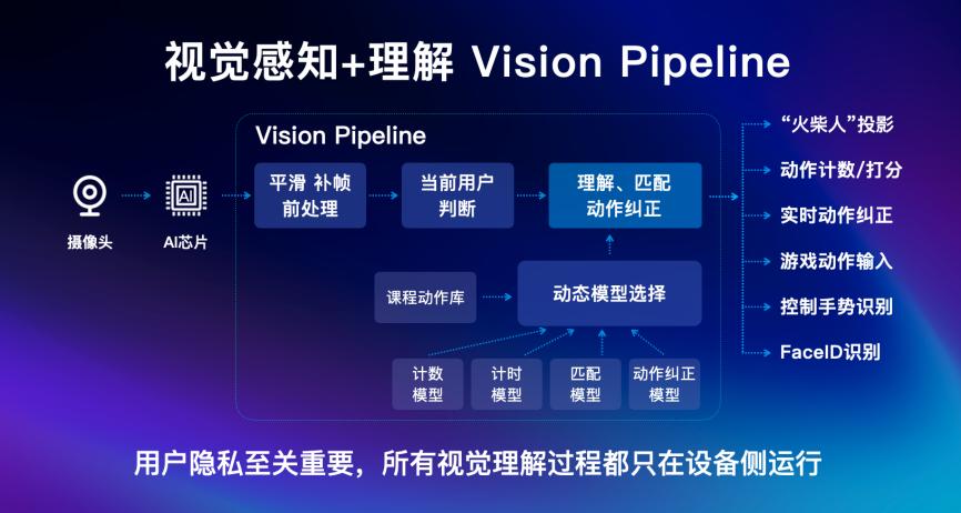 在这一过程中,用户的隐私至关重要。在添添智能健身镜上,AI边缘计算芯片捕捉到的都是骨骼关键点而非图片,所有视觉理解算法都是在设备本地化而非通过云端计算来完成,用户大可放心自己的隐私。